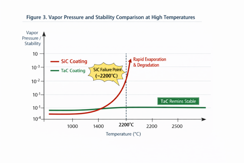 Kestabilan Termodinamik yang Tidak Ditandingi: Tantalum Carbide (TaC) mempunyai takat lebur yang mengejutkan sebanyak 3880°C. Menurut penyelidikan dalam Journal of Crystal Growth, salutan SiC mengalami "penyejatan tidak selaras" di atas 2200°C—di mana silikon menyublim lebih cepat daripada karbon, yang membawa kepada degradasi struktur dan pencemaran zarah. Sebaliknya, tekanan wap TaC ialah 3 hingga 4tertib magnitud lebih rendah daripada SiC, mengekalkan medan haba murni untuk pertumbuhan kristal.